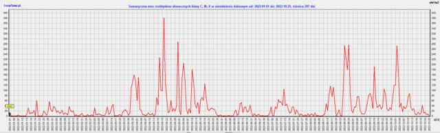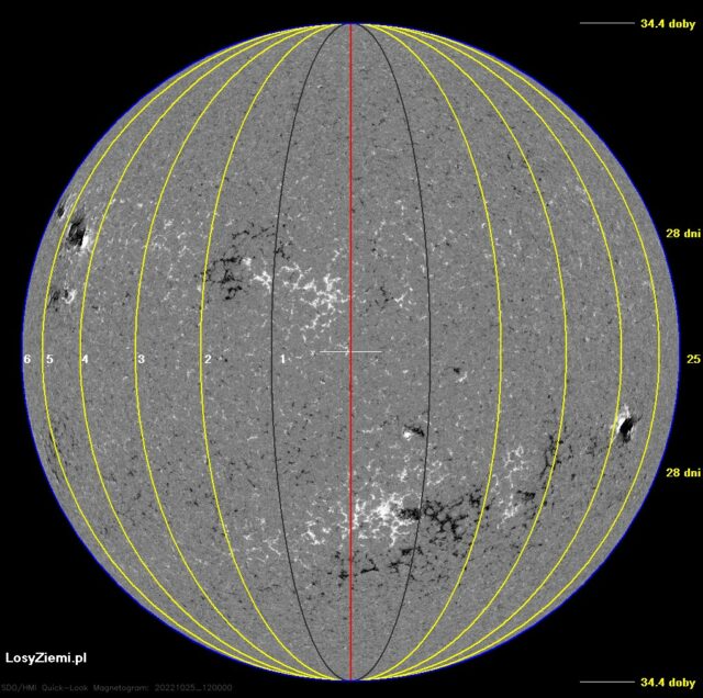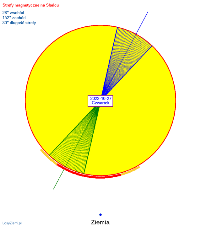 W czwartek 27 października 28 stopni na wschód względem Ziemi wystąpi silny szczyt strefy magnetycznej. Strefy tworzą się na kilka dni przed szczytami, ich polaryzacja słabnie przez kilka dni po szczytach.