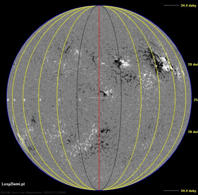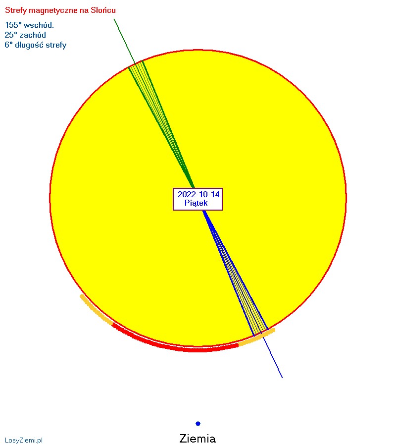 W piątek 14 października na Słońcu, 10 stopni na zachód względem pozycji na wprost Ziemi wystąpi szczyt średniej siły strefy magnetycznej. Kolejny szczyt wystąpi 17 października 24 stopnie na wschód tarczy Słońca, więc będzie groźniejszy. Strefy tworzą się na kilka dni przed szczytami, ich polaryzacja słabnie przez kilka dni po szczytach.