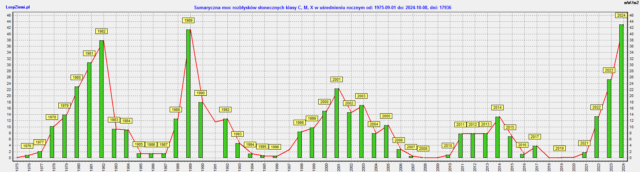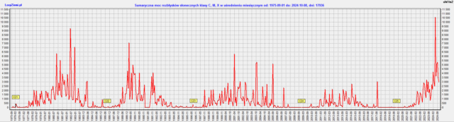 Sumaryczna moc wszystkich rozbłysków słonecznych (x-Ray) klasy C, M oraz X od 1 stycznia do 8 października 2024 roku jest największa od co najmniej 1975 roku, kiedy rozpoczęto pomiary.