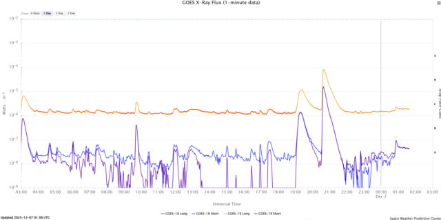 W sobotę 6 grudnia o 20:39 UTC na Słońcu, dokładnie na wprost Ziemi (E01) i 20 stopniu północnym (N20) wystąpił szczyt bardzo silnego rozbłysku klasy M8.1, jest to moc 81 uW/m2. Oba opisane zdarzenia wystąpiły w okolicach szczytów swoich oddziaływań, o czym poniżej napiszę.