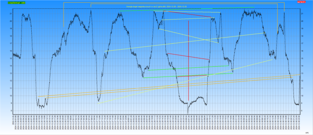 Czerwona, pionowa kreska, to prawdopodobnie środek cyklu. Linie łączą miejsca zmian przed i za środkiem cyklu, które wywołało to samo oddziaływanie, a rozmawiamy o planetach i trzecim, najsłabszym oddziaływaniu na naszą jonosferę. Jonosfera odpowiedzialna jest za generowanie tych drgań.