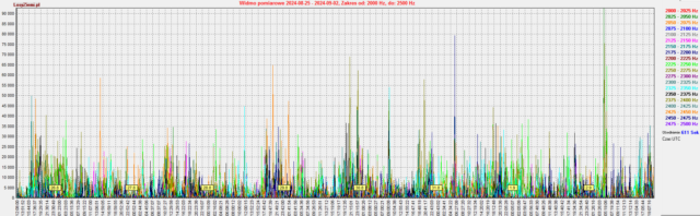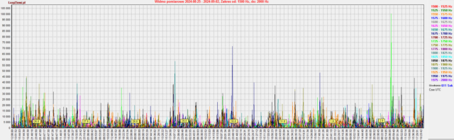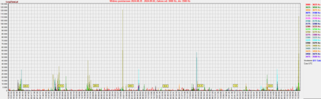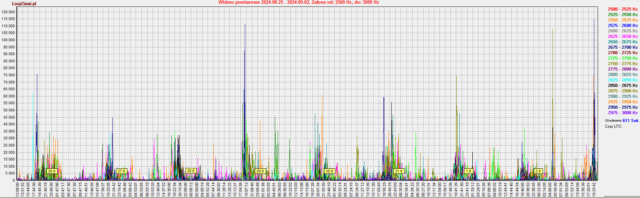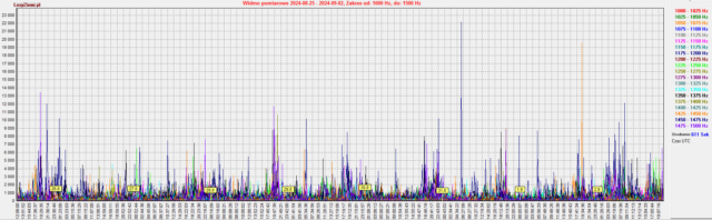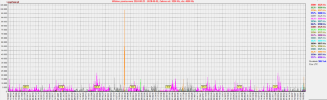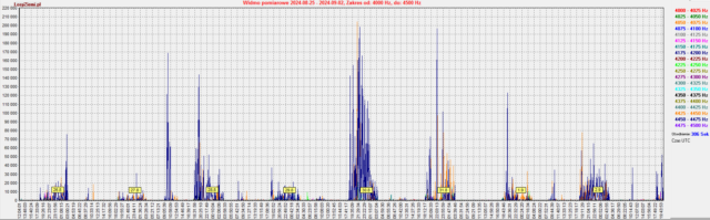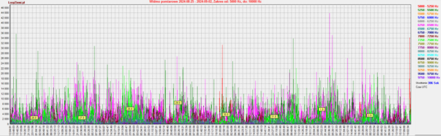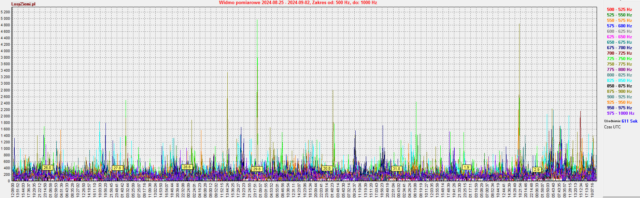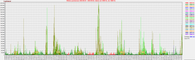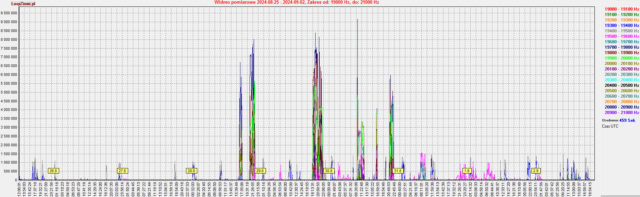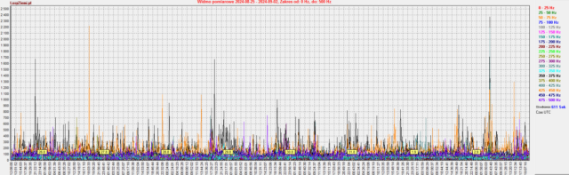 Pomiary częstotliwości składowych ziemskiego pola magnetycznego w osi pionowej – generowane przez jonosferę. Wykresy podzielone są po 500 Hz do 5 kHz. Szybka transformacja Fouriera (FFT), ostatnie 200 godzin pomiarów – 25 sierpnia do 2 września. Zakres 3-4 kHz najmocniej wpływa na istoty żywe, w tym na człowieka.