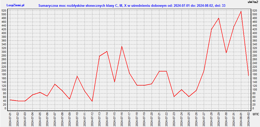 Przez 7 miesięcy i trochę ponad jedną dobę w 2024 roku sumaryczna moc rozbłysków x-Ray osiągnęła 31 915 uW/m2, czyli prawie 32 mW/m2.