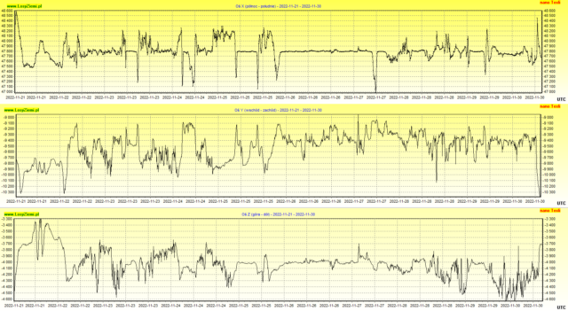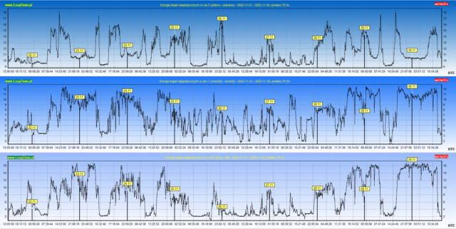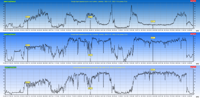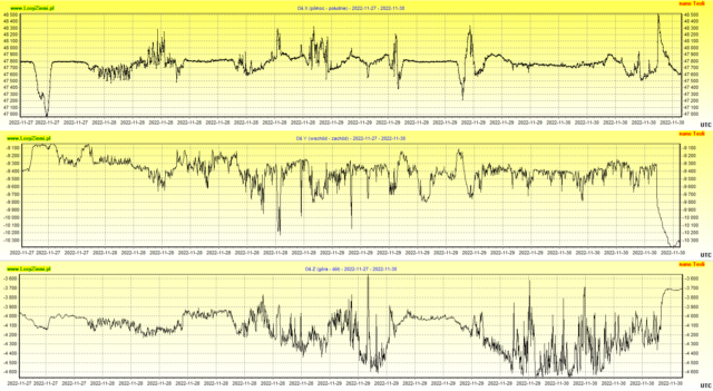 W ostatnich kilku dniach występują duże zmiany w pomiarach pola magnetycznego Ziemi, zmiana w osi Y (wschód-zachód) wyniosła aż 1 uT, w ciągu zaledwie 75 minut.