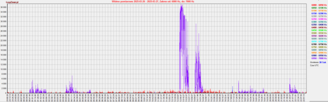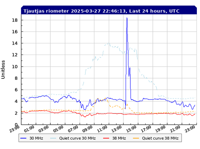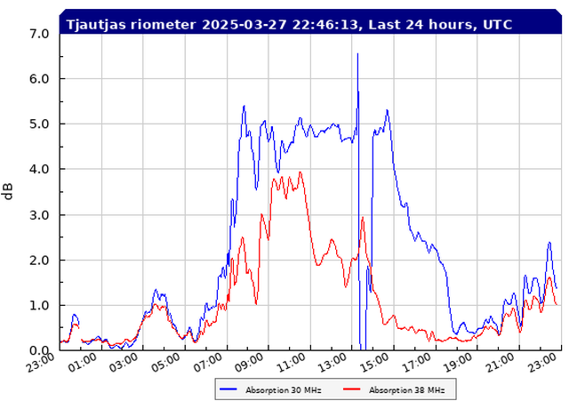 W czwartek 27 marca od godziny 12:51 UTC do 13:35 wystąpiło w moich pomiarach ogromne zaburzenie na dokładnie 7 kHz. Silne zaburzenie w tym samym czasie zostało zarejestrowane na riometrze w szwedzkim Tjautjas.