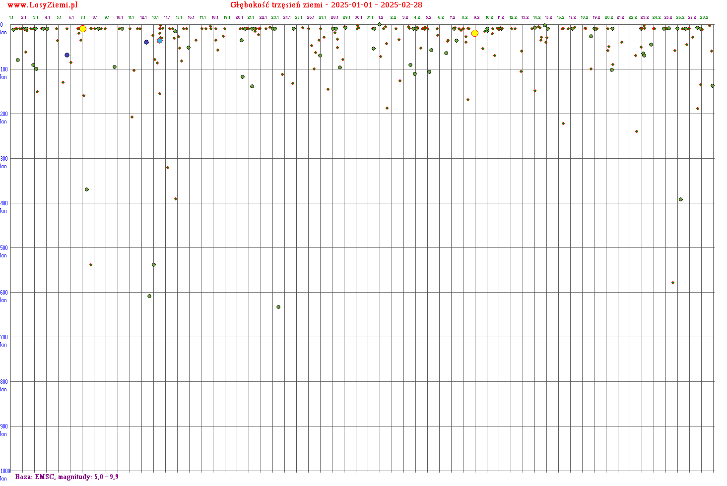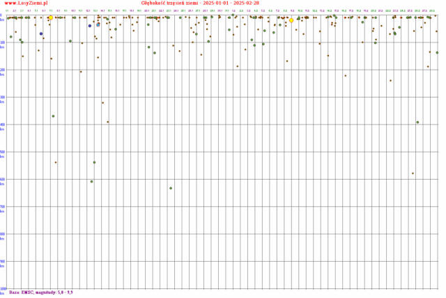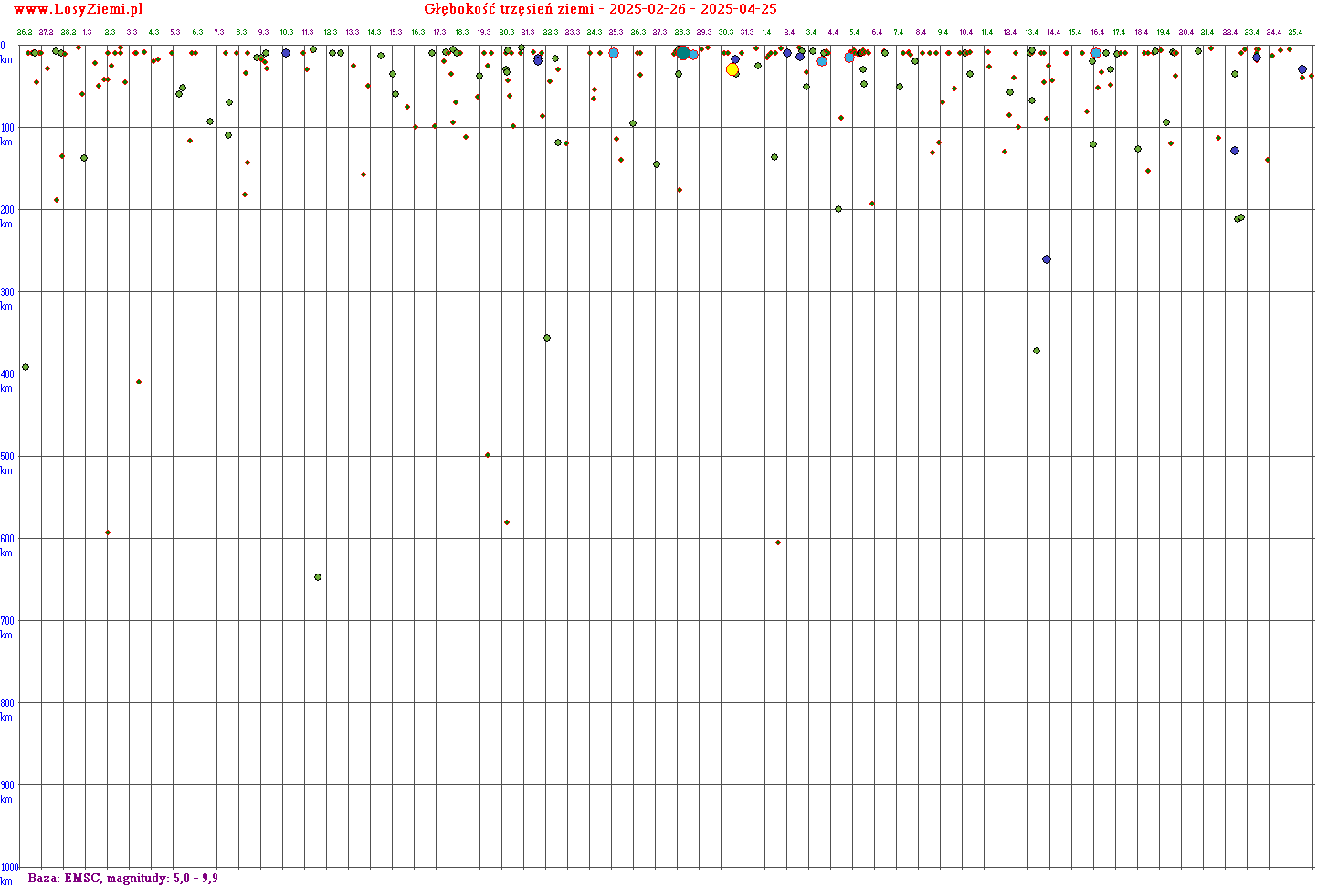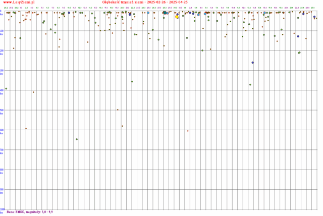 Głębokości trzęsień ziemi od magnitudy 5.0, od 1 stycznia 202525 kwietnia 2025 roku. Magnituda 5.0 to energia 2 TJ (554 MWh), a 7.7, które wystąpiło w Birmie 28 marca, to energia 22.4 PJ (6.22 TWh). Baza EMSC.