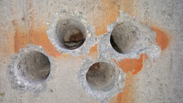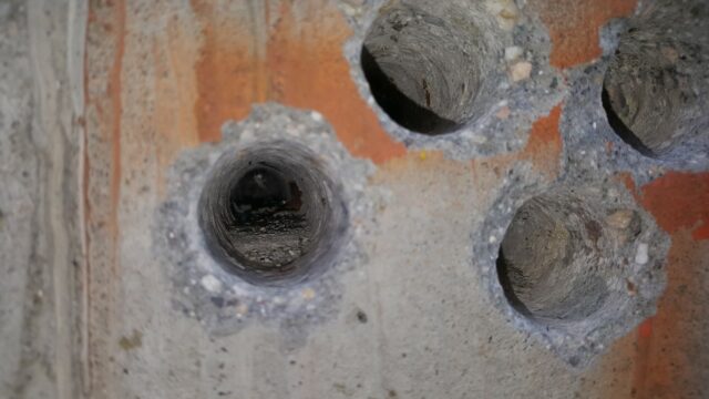 W podstawie komina umieszczono ładunki wybuchowe, po których zdetonowaniu budowla przewróciła się w kierunku Odry. Poniżej zdjęcia wierceń na ładunki.