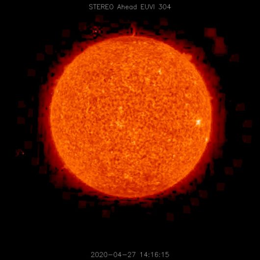 Patrząc na zdjęcia z satelity STEREO Ahead, która obecnie obserwuje wschodnią część tarczy Słońca, widać pod koniec filmu strumień plazmy lecący w kierunku Ziemi. Jeśli tak się stało, możemy spodziewać się burzy geomagnetycznej na przełomie kwietnia i maja. Znacznie gęstsza „chmura” plazmy minie Ziemię od północy.