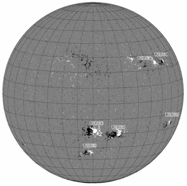 Na wprost Ziemi znajdują się 3 aktywne plamy słoneczne, z czego plama 2866 jest najbardziej aktywna.