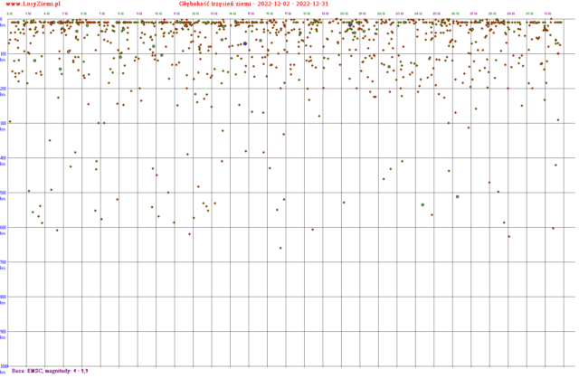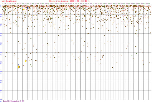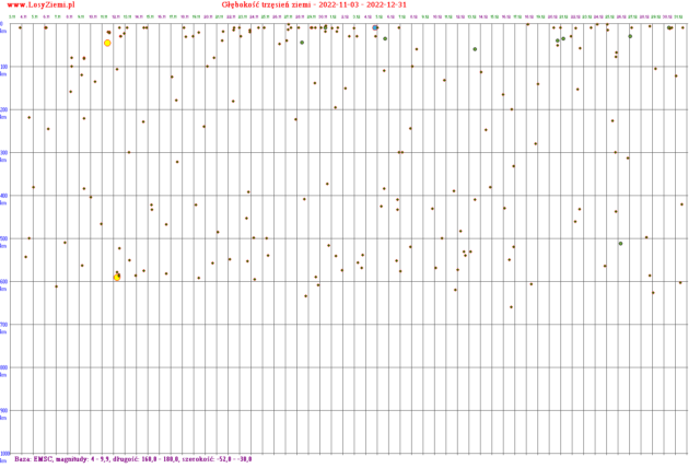 W wielu tych zaznaczonych zieloną linią wstrząsach sejsmicznych był BARDZO zbliżony stosunek przesunięcia czasu do głębokości przy kilku zdarzeniach z rzędu. To nie zawsze wygląda na przypadek, a obserwuję to od kilku lat. Poniżej wstrząsy od magnitudy 4.0. Większość głębokich wstrząsów od 300 km to rejon od Nowej Zelandii po Fidżi, gdzie jest niezwykłe miejsce subdukcji płyty tektonicznej pod wyjątkowo dużym kątem około 45 stopni. Kilka pozostałych głębokich wstrząsów to Indonezja i Japonia.