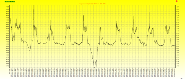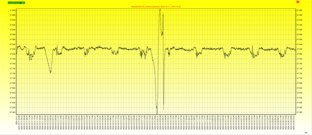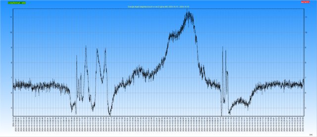 Sumaryczna energia drgań magnetycznych z trzech osi od 11 – 20 października. Pomiary znajdują się w Głogowie, próbkowanie magnetometru 75 Hz.