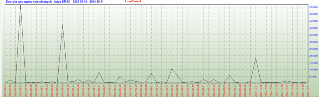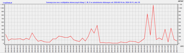 Porównanie mocy rozbłysków słonecznych x-Ray do aktywności sejsmicznej planety od 14 sierpnia do 11 października, baza trzęsień ziemi z EMSC, rozbłysków słonecznych z NASA.