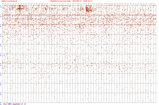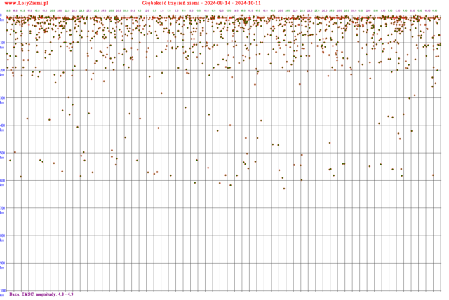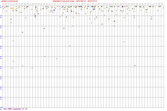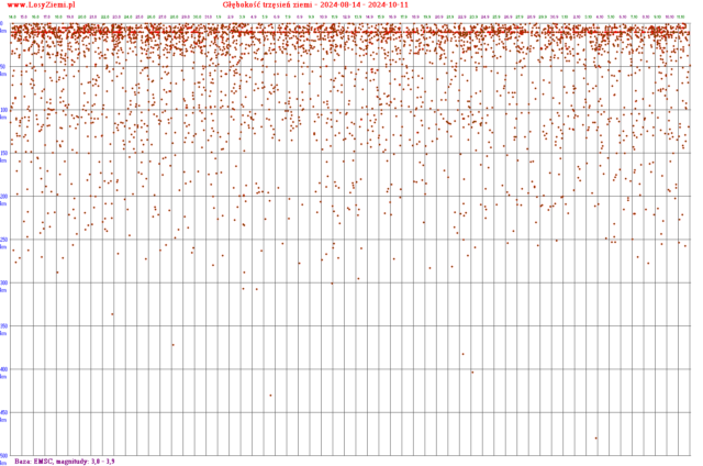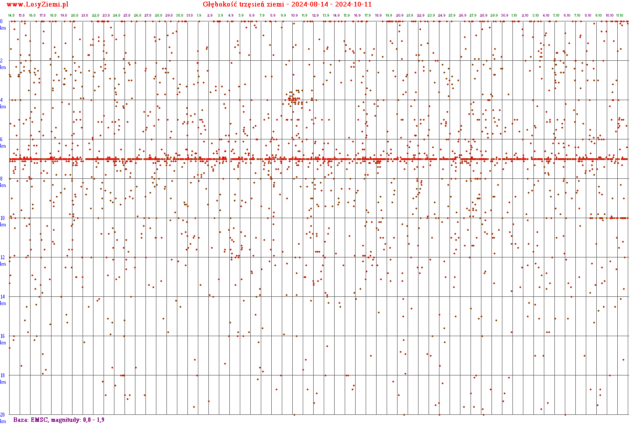 Poniżej znajdują się głębokości trzęsień ziemi na całym świecie, pogrupowane na zakresy magnitud (energii).