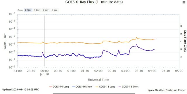O 3:16 UTC na wchodzie wystąpił szczyt rozbłysku klasy C5.4, a o 3:25 na zachodzie klasy C9.6 (9.6 uW/m2). Zdarzenia nałożyły się na siebie, a szczyty rozbłysków przesunięte były o zaledwie 9 minut. Zjawisko jest częste, ale ułożenie planet, które umożliwi nam zobaczenie równocześnie obu; występuje dość rzadko, prawie dekadę temu opisywałem mechanizm na Forum.