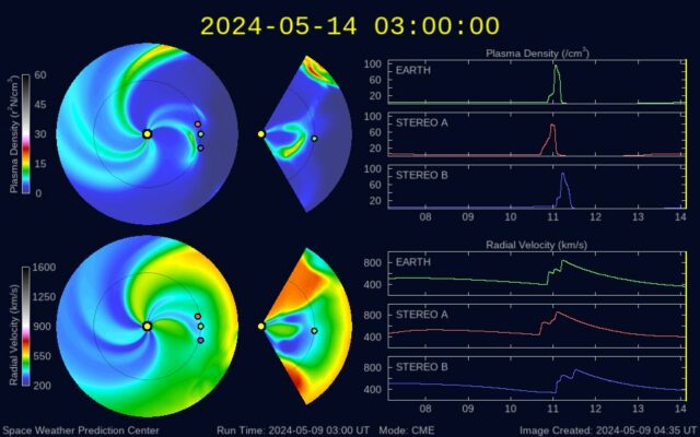 NASA przewiduje silną burzę geomagnetyczną na noc z piątku na sobotę 10/11 maja. Prawdopodobnie dzisiejszy wyrzut plazmy po bardzo silnym rozbłysku nie jest uwzględniony w prognozie.