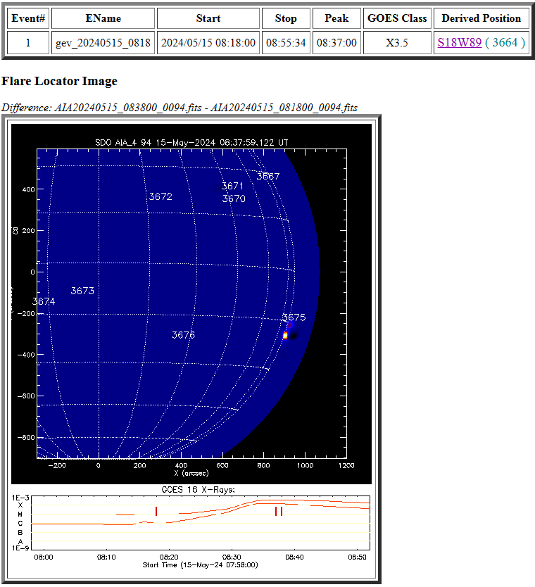 Rozbłysk klasy X3.5 szczyt miał o 8:37 na 89 stopniu zachodnim, z powodu tak dużego kąta, położenie źródła może być źle wyliczone nawet o 2 stopnie, więc można przyjąć, że dokładnie po przekątnej.