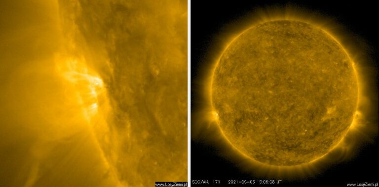 Na wschodzie tarczy Słońca, tuż pod równikiem widoczna jest już bardzo aktywna plama, która w niedzielę, 9 maja znajdzie się na wprost Ziemi. Plama „w obiektywie” satelity SDO w tej chwili wygląda tak: Nowa plama względem plamy z 3 kwietnia przesunęła się kilkanaście stopni na północ i znacznie zwiększyła aktywność. Poprzednio plama uspokoiła się gdy … Czytaj dalej Słońce – Bardzo aktywna plama zbliża się od wschodu, na wprost Ziemi znajdzie się 9 maja