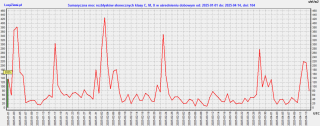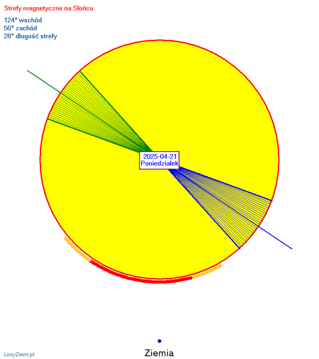 Szczyt bardzo silnej strefy magnetycznej wystąpi w poniedziałek 21 kwietnia na 56 stopniu zachodnim oraz na 124 stopniu wschodnim. Długość strefy może wynosić aż 28 stopni. Strefy tworzą się na kilka dni przed szczytami, ich polaryzacja słabnie przez kilka dni po szczytach. W przypadku silnych stref nawet do 6 dni.