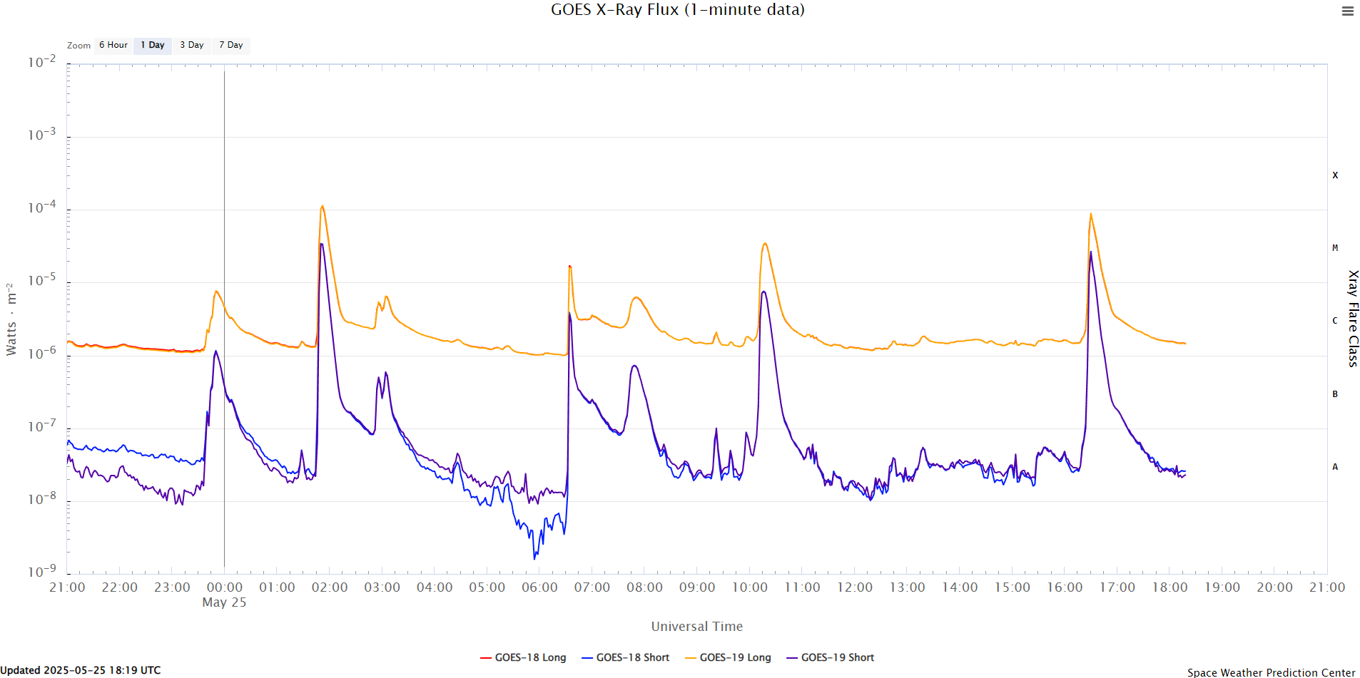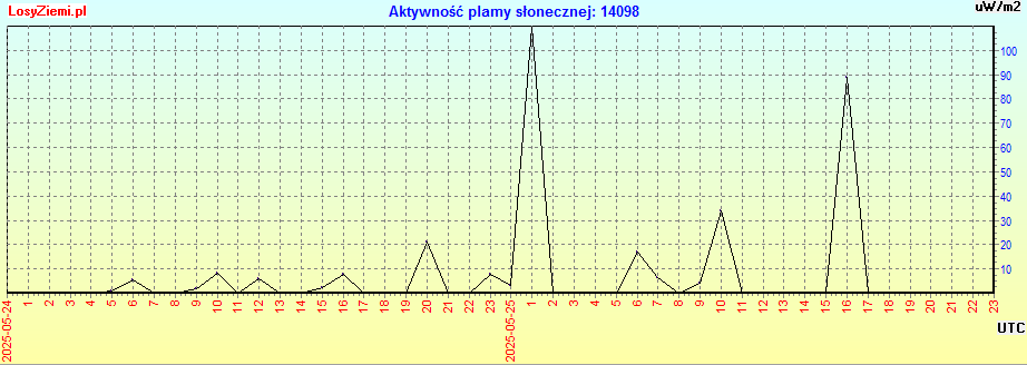 W niedzielę 25 maja o 3:52 czasu w Polsce (UTC+2) wystąpił bardzo silny rozbłysk słoneczny klasy X1.1 z plamy 4098 na 44 stopniu zachodnim. Kolejny rozbłysk x-Ray klasy M8.9 wygenerowała ta sama plama na 53 stopniu zachodnim ze szczytem o 18:30.