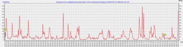 Zobaczcie jak dziś wzrosła aktywność Słońca po tych 13 silnych rozbłyskach klasy M i jednym bardzo silnym klasy X. Sumaryczna moc rozbłysków x-Ray w dniu dzisiejszym wynosi aż 509 uW/m2. Jeśli aktywność wzrośnie dziś do co najmniej 586 uW/m2, to będzie największa od 30 grudnia 2024 roku, na daną chwilę jest największa od 11 listopada 2025 roku.