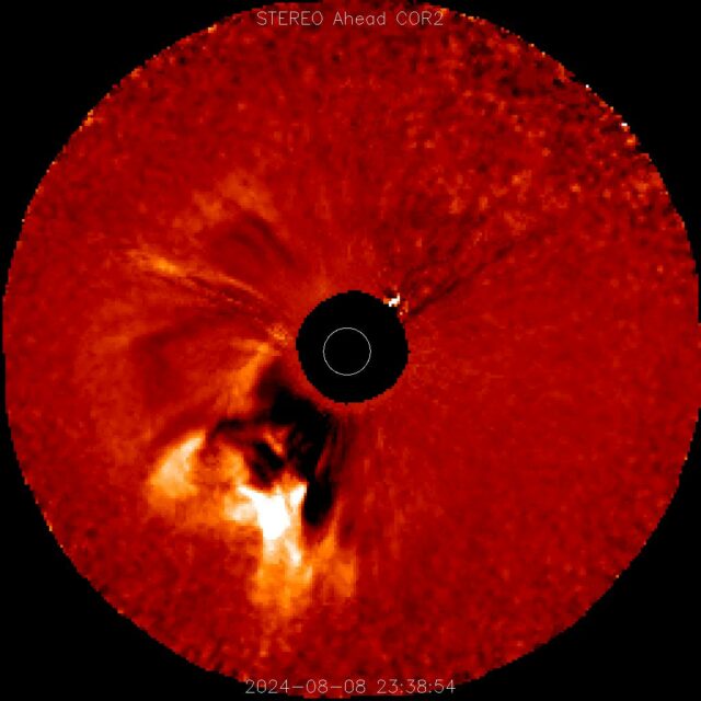 Zdjęcia z koronografu satelity STEREO-Ahead pokazują, że główny obłok najgęstszej plazmy poleciał mocno na południe.