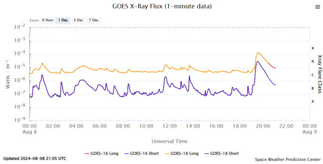 Bardzo silny rozbłysk słoneczny klasy X1.3 szczyt miał w czwartek 8 sierpnia o 21:35 czasu w Polsce z plamy 3777 na 22 stopniu zachodnim.