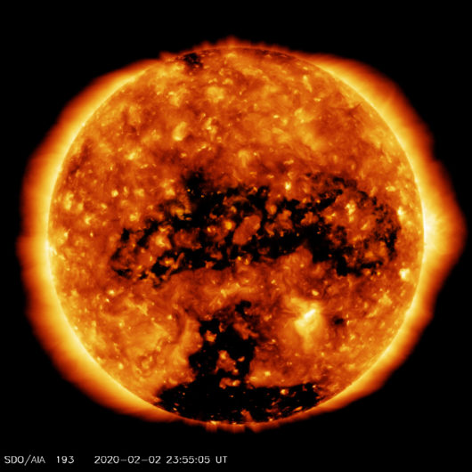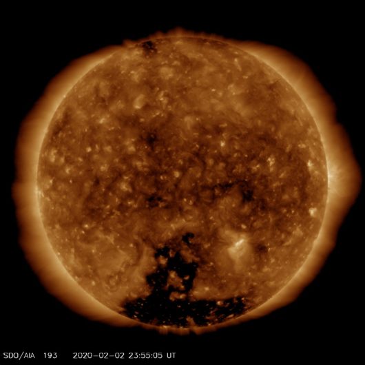 Na wprost Ziemi znajduje się aktualnie lewitująca plazma, ale o dość małej gęstości, dlatego nie tworzy dużych widocznych dziur koronalnych, pomijając oczywiście dziurę koronalną na biegunie południowym Słońca. Ona jest dla nas nieszkodliwa, nie ten kąt dla elektronów.