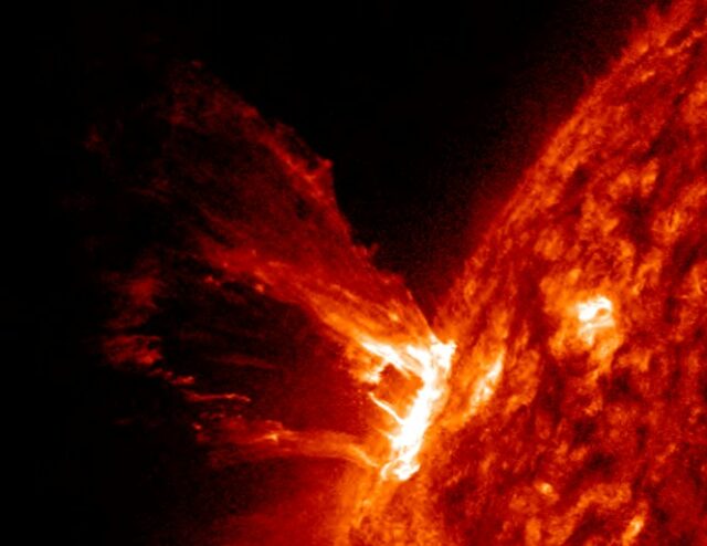 Dwa wyrzuty plazmy na dalekim wschodzie, kolejny na wprost Ziemi – plazma minie nas „o włos” od zachodu – i kolejny na zachodzie.