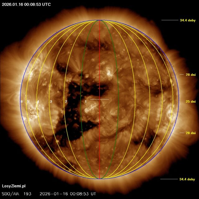 Na wprost Ziemi znajduje się duża dziura koronalna, która emituje w naszą stronę elektrony i wiatr słoneczny.