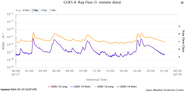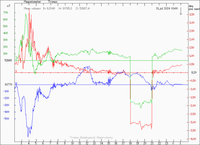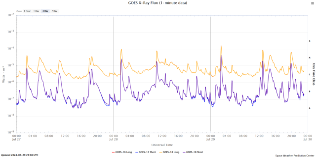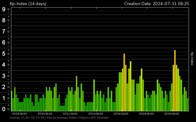 Wyjątkowo krótka burza geomagnetyczna wystąpiła 30 lipca o 4 UTC (6-ta polskiego czasu). Gdyby szczyt trwał 3 godziny, mielibyśmy mocne G4, ale z racji tego, że trwało to bardzo krótko, uśrednienie dało nam G1. Być może jeszcze coś doleci po rozbłysku klasy X1.5.