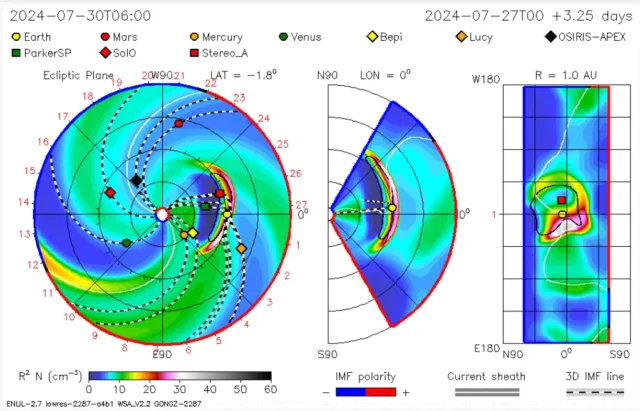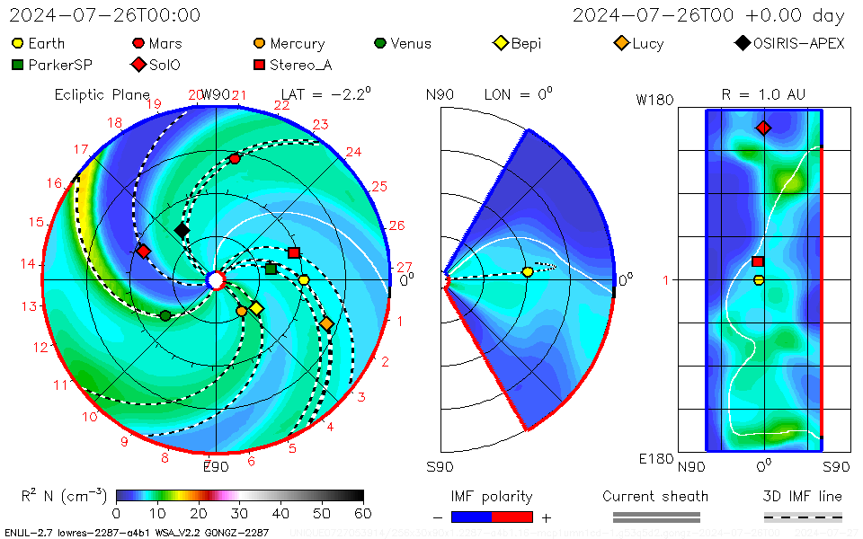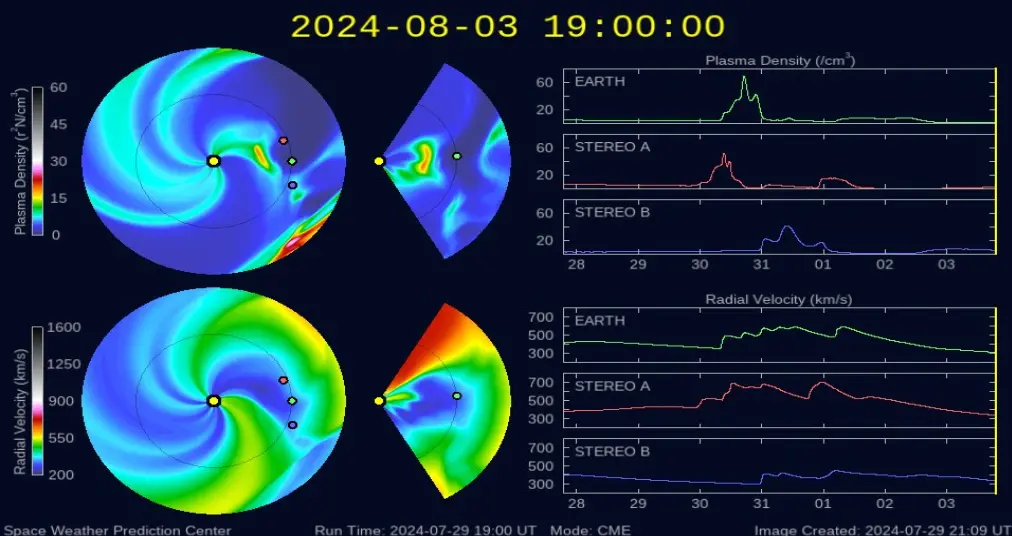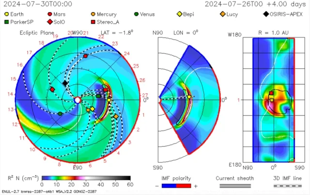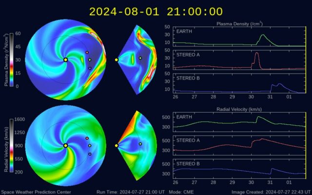 Zmieniła się prognoza NASA, gęstość plazmy może wynieść około 80 cząstek na cm3, ta z 11 maja miała prognozowane 100. Burza GM rozpocznie się prawdopodobnie pod wieczór 30 lipca.