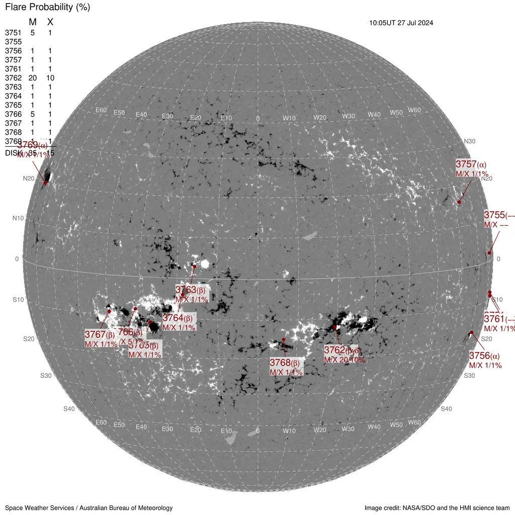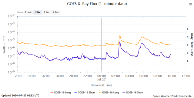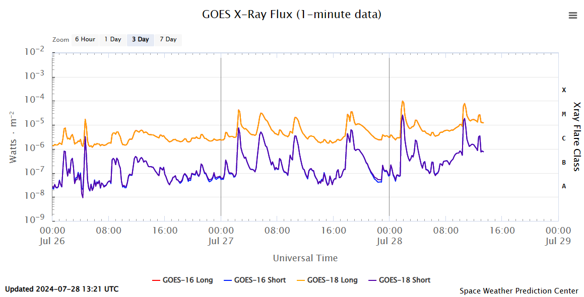 W sobotę 27 lipca o 4:37 wystąpił szczyt silnego rozbłysku słonecznego klasy M4.2 z plamy 3766 na 25 stopniu wschodnim, kolejny silny rozbłysk x-Ray klasy M3.1 wystąpił z plamy 3762 o 7:46 na 25 stopniu zachodnim.