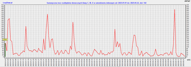 Szczyty dwóch średniej siły stref magnetycznych wystąpią w środę 28 maja na 10 stopniu wschodnim oraz po drugiej stronie Słońca na 170 stopniu zachodnim. Druga strefa wystąpi na 72 stopniu wschodnim oraz na 108 stopniu zachodnim. Długość pierwszej strefy może wynieść 6 stopni, drugiej 8 stopni. Strefy tworzą się na kilka dni przed szczytami, ich polaryzacja słabnie przez kilka dni po szczytach. W przypadku silnych stref nawet do 6 dni.