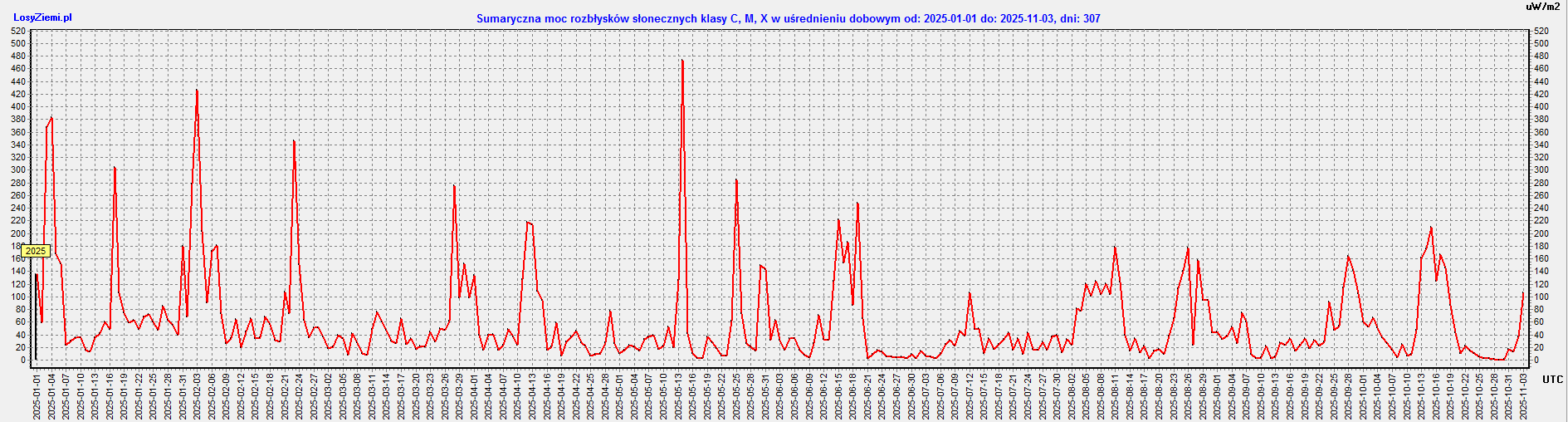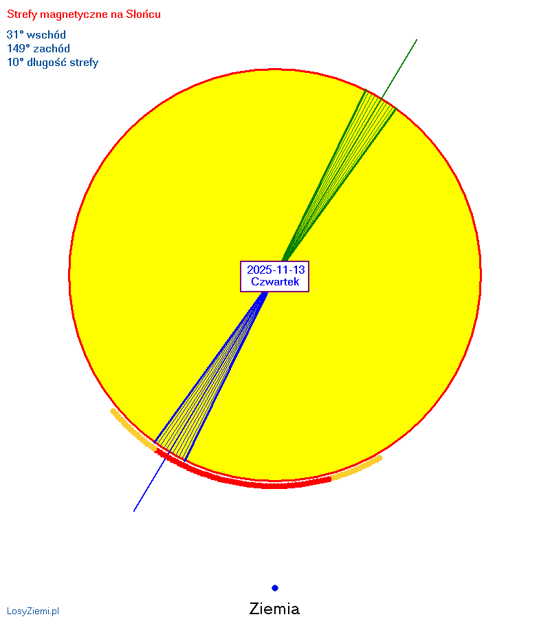 Szczyt średniej siły strefy magnetycznej wystąpi w niedzielę 9 listopada na 48 stopniu wschodnim oraz na 132 stopniu zachodnim. Długość strefy może wynieść 8 stopni. Kolejna średniej siły strefa magnetyczna wystąpi w czwartek 13 listopada na 31 stopniu wschodnim oraz na 149 stopniu zachodnim. Długość strefy może wynieść 10 stopni. Strefy tworzą się na kilka dni przed szczytami, ich polaryzacja słabnie przez kilka dni po szczytach. W przypadku silnych stref nawet do 6 dni, przy czym nie są to zmiany liniowe, a duży wzrost widoczny jest zazwyczaj dopiero po połowie tego czasu.