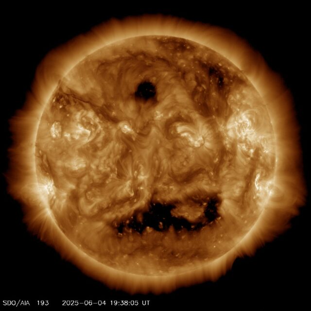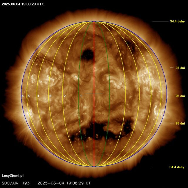 Na Słońcu, w pozycji na wprost Ziemi znajdują się dziury koronalne, które emitują elektrony i wiatr słoneczny.