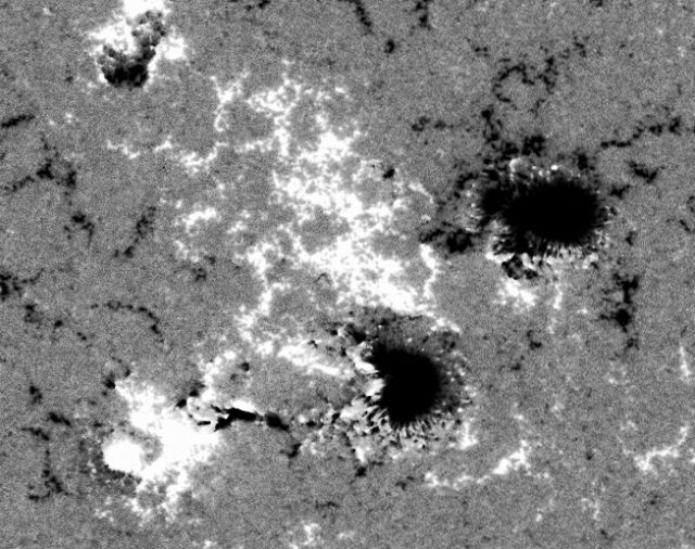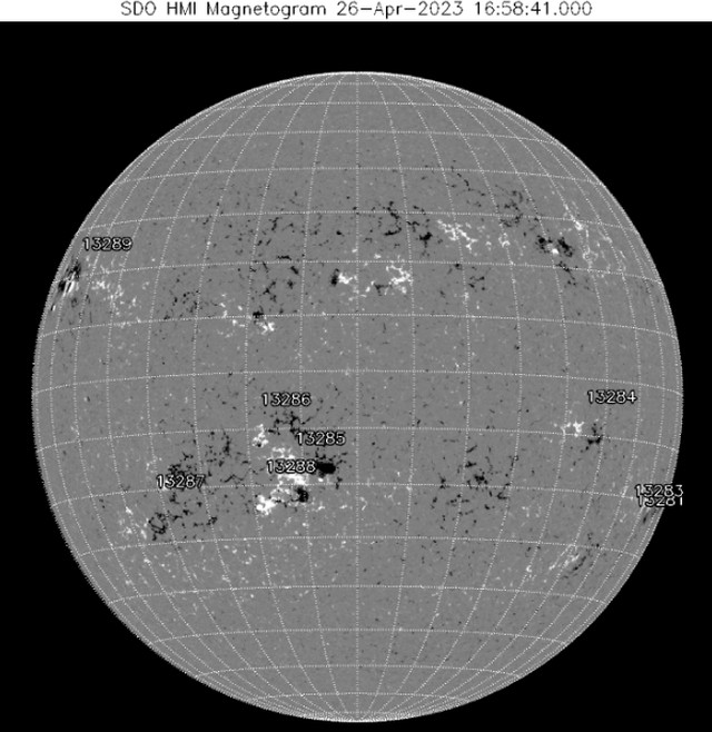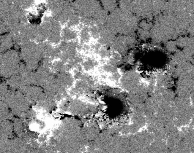 Plamy słoneczne w silnej strefie magnetycznej, której szczyt polaryzacji był 26 kwietnia.
