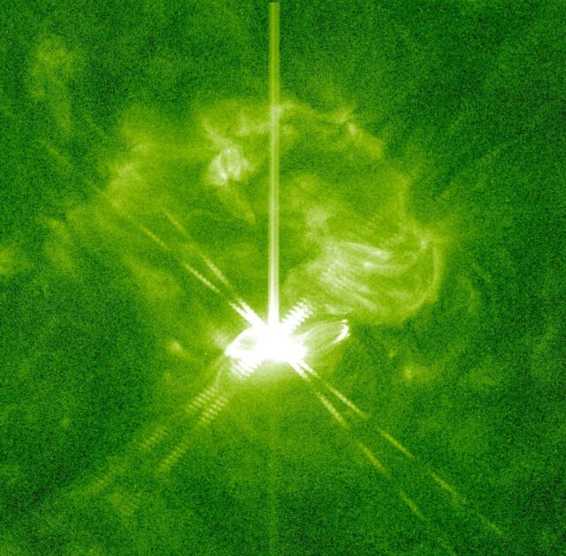 Ciekawie wyglądający wyrzut plazmy na północnym wschodzie tarczy Słońca.