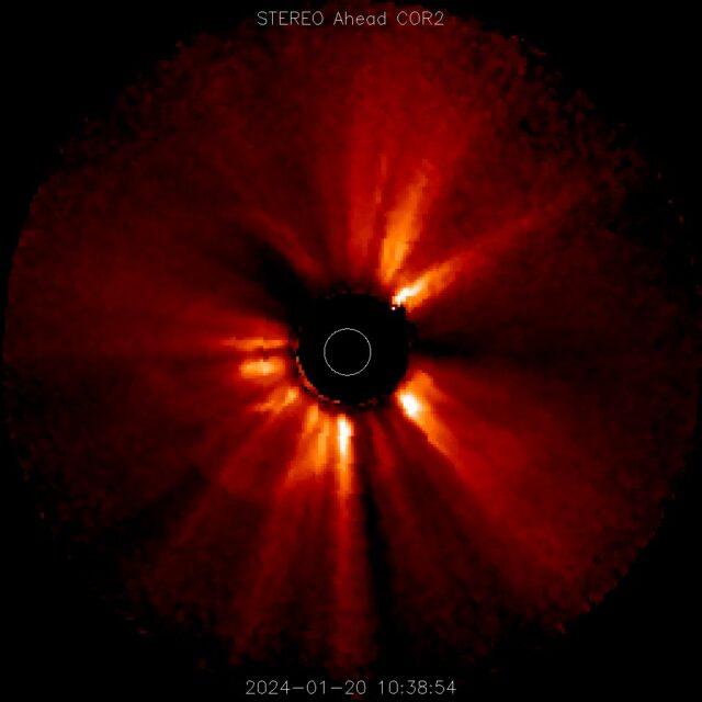 Koronograf na satelicie STEREO-Ahead, który aktualnie znajduje się około 10 stopni na zachód zarejestrował plazmę lecącą w naszym kierunku.