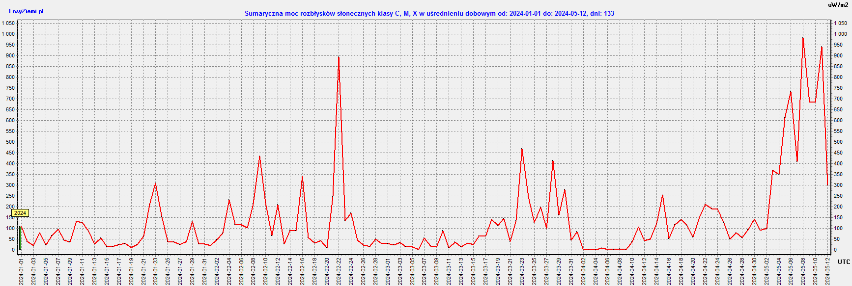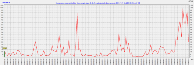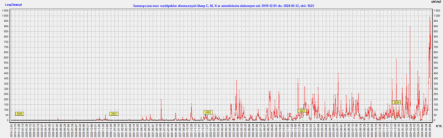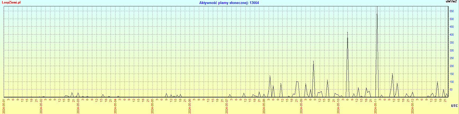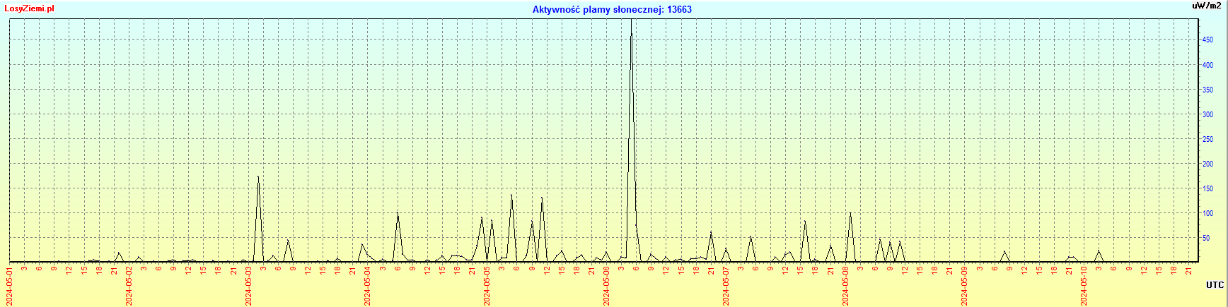Plama 3663 wygenerowała pierwszy bardzo silny rozbłysk klasy X1.7 – 3 maja ze szczytem o 2:22 UTC. Wszędzie, gdzie będzie czas, będzie to UTC, w Polsce mamy UTC+2h. Plama ostatni rozbłysk wygenerowała 8 maja ze szczytem o 1:41. Rozbłysków w klasy X było 5. Dwa rozbłyski klasy X1.3 plama wygenerowała na 22 i 23 stopniu zachodnim, czyli dokładnie – w samym środku strefy magnetycznej z 22 kwietnia – w odstępie zaledwie 6 godzin bez 7 minut. Plama znajdowała się na 25° północnym, większość wyrzutów plazmy była na północ.