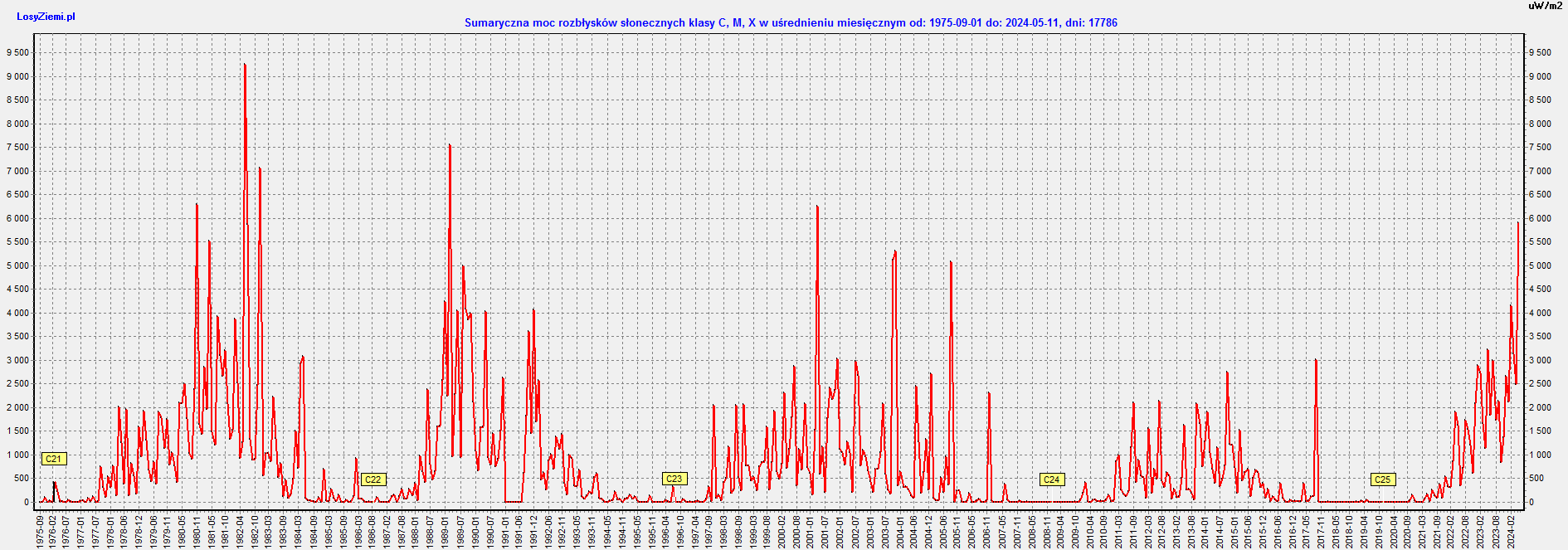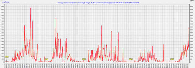 Najaktywniejszym miesiącem w historii pomiarów x-Ray (od 09.1975) był czerwiec 1982 roku z 9.256 mW/m2. Następny w kolejności to marzec 1989 roku z 7.56 mW/m2.