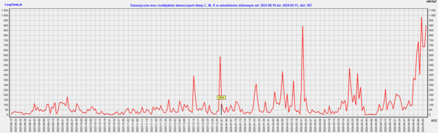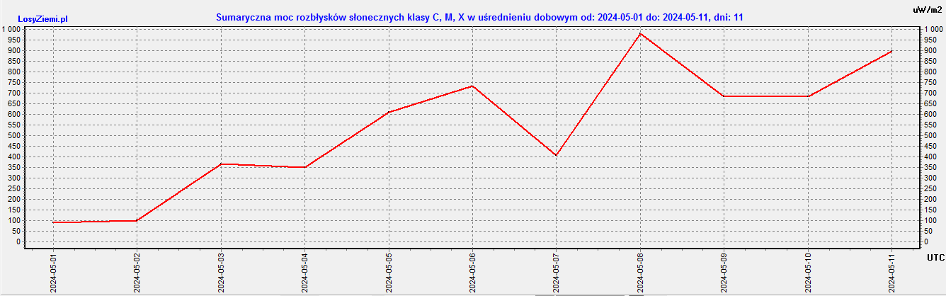 Do godziny 20-tej 11 maja mamy już 5.9 mW/m2 rozbłysków x-Ray dla długości fali 100-800 pm (pikometrów), a to dopiero prawie 11 dni miesiąca.