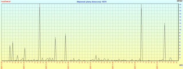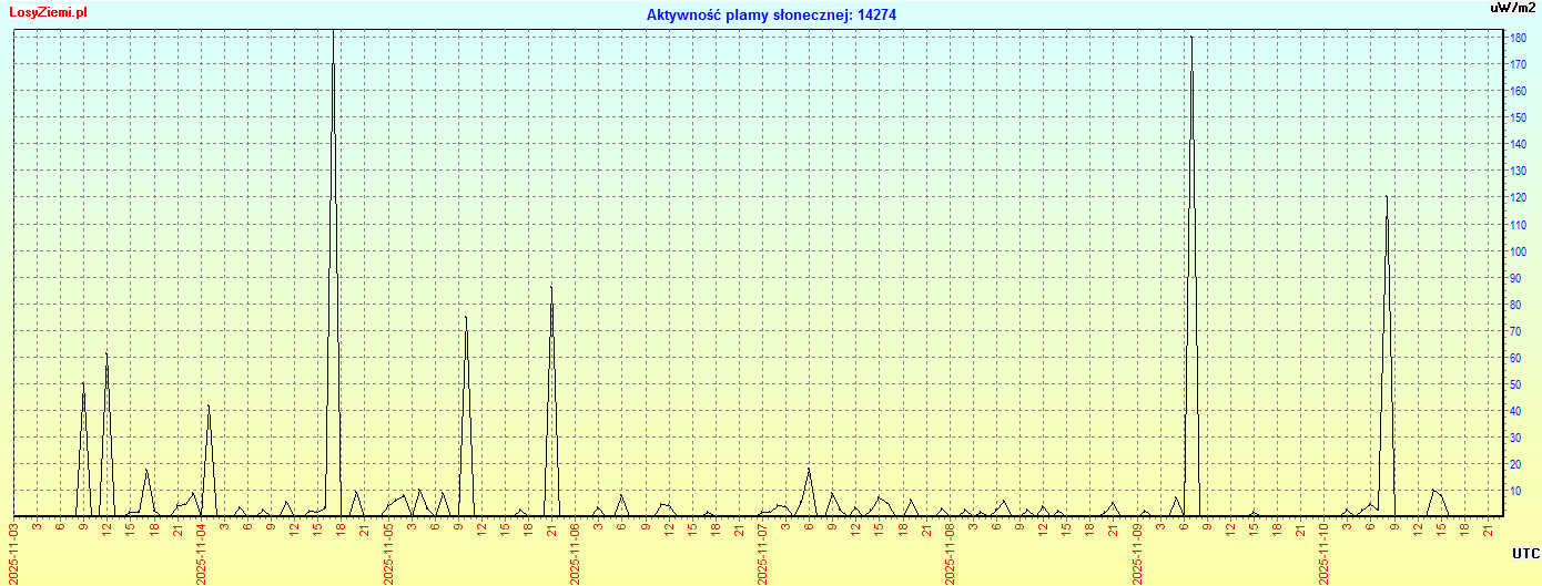W poniedziałek 10 listopada o 10:19 czasu w Polsce na Słońcu wystąpił szczyt bardzo silnego rozbłysku klasy X1.2 na 14 stopniu zachodnim i 23 stopniu północnym (W14,N23).