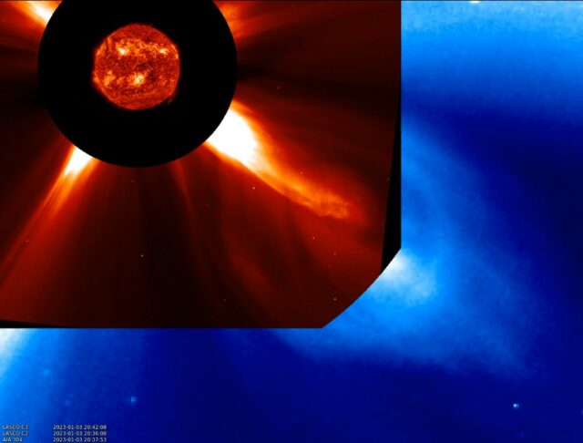We wtorek 3 stycznia około 14:00 polskiego czasu nastąpił potężny wyrzut plazmy na zachodzie tarczy Słońca.