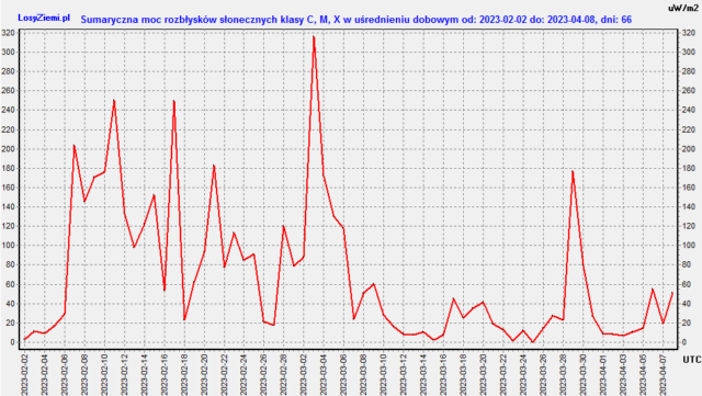 Plama wygenerowała 6 kwietnia na 87 stopniu silny rozbłysk klasy M3.0, kolejny dziś 8 kwietnia o 3:46 czasu w Polsce klasy M2.9 na 61 stopniu.