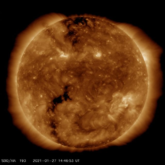 Jeszcze dziś w nocy na wprost Ziemi znajdzie się dziura koronalna znajdująca się tuż pod równikiem słonecznym, naprzeciw plamy.