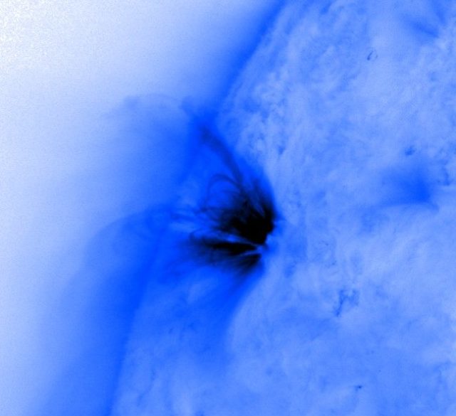 Na wschodzie tarczy Słońca, kilkanaście stopni nad równikiem pojawiła się niewielka, ale dość aktywna plama słoneczna. Prawdopodobnie otrzyma numer 2800.