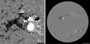 Plama słoneczna o numerze 2882 od dwóch dni przechodzi przez strefę magnetyczną, którą wcześniej opisywałem. Plama na razie wygenerowała kilka rozbłysków klasy C. Dziś znajdzie się na wprost Ziemi. W trakcie przygotowywania materiałów do tej informacji plama wygenerowała duży wyrzut plazmy, ale na razie jeszcze nie widać, gdzie poleciało. Poniżej położenie plamy względem pozycji na … Czytaj dalej Słońce – Plama 2882 przechodzi przez strefę magnetyczną, wzrosła jej aktywność, w sobotę znajdzie się na wprost Ziemi