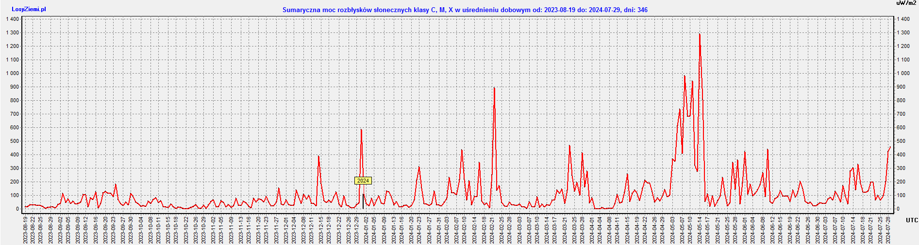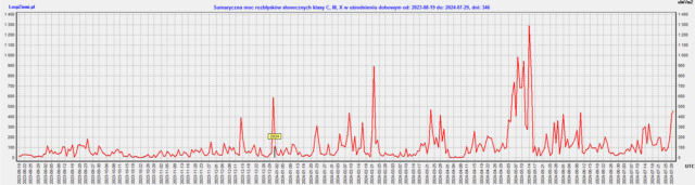 Sumaryczna moc rozbłysków słonecznych x-Ray osiągnęła dziś moc 458 uW/m2, a tym samym mamy największą moc rozbłysków od 14 maja, który był rekordowy.