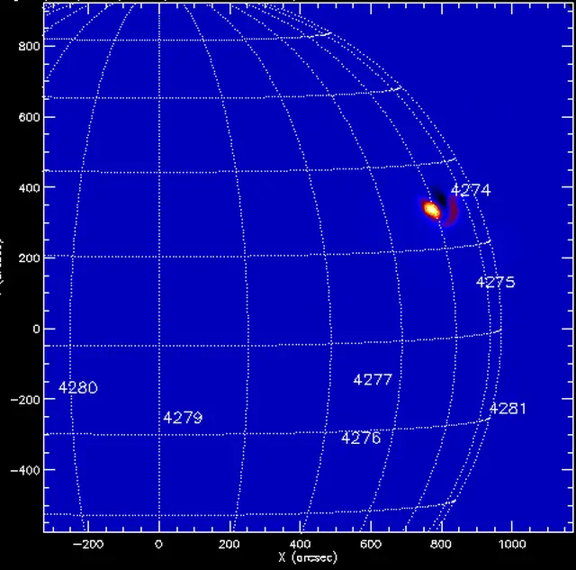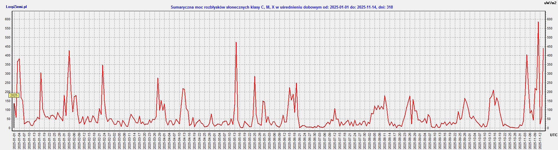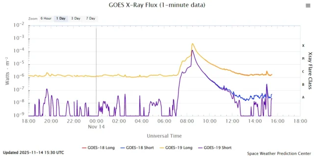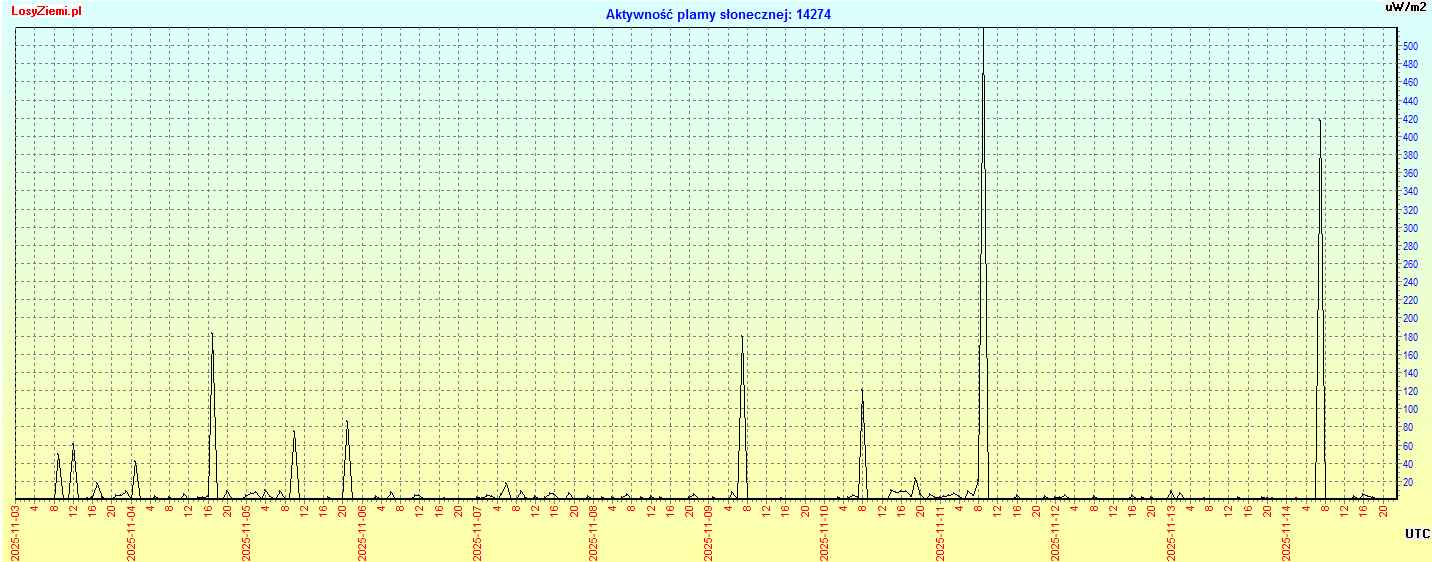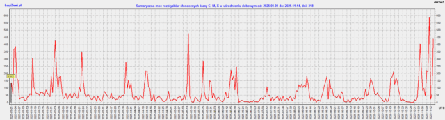 W piątek 14 listopada o 9:30 czasu w Polsce na Słońcu wystąpił szczyt bardzo silnego rozbłysku klasy X4.0 na 58 stopniu zachodnim i 23 stopniu północnym (W14, N21).