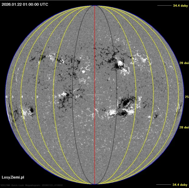 Maksimum polaryzacji wystąpi między czwartą, a piątą dobą, czyli fotosfera przesunie się w tym czasie do miejsca, gdzie na magnetogramie widać plamę 4341, która odpowiedzialna jest za rozbłysk klasy X1.9 18 stycznia i ekstremalnie silną burzę geomagnetyczną z 19 i 20 stycznia i zorze polarne widoczne na terenie całej Polski.